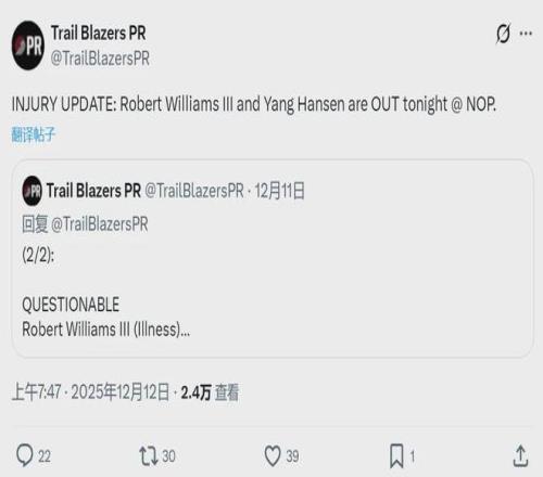 北京时间12月12日,NBA常规赛:鹈鹕主场vs开拓者。赛前开拓者官方宣布:杨瀚森(面部挫伤)和罗威(生病),今天休战。这是杨瀚森进入NBA之后,生涯第一次因伤缺席比赛。今天克林根也不打,小杨没受伤的话本来是个机会。