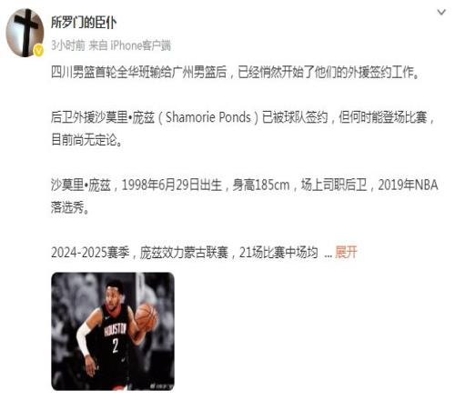 如今根据媒体人所罗门的臣仆报道:“四川男篮首轮全华班输给广州男篮后,已经悄然开始他们的外援签约工作。NBA落选秀后卫外援沙莫里-庞兹已被球队签约,但何时能登场比赛,目前尚无定论。”
